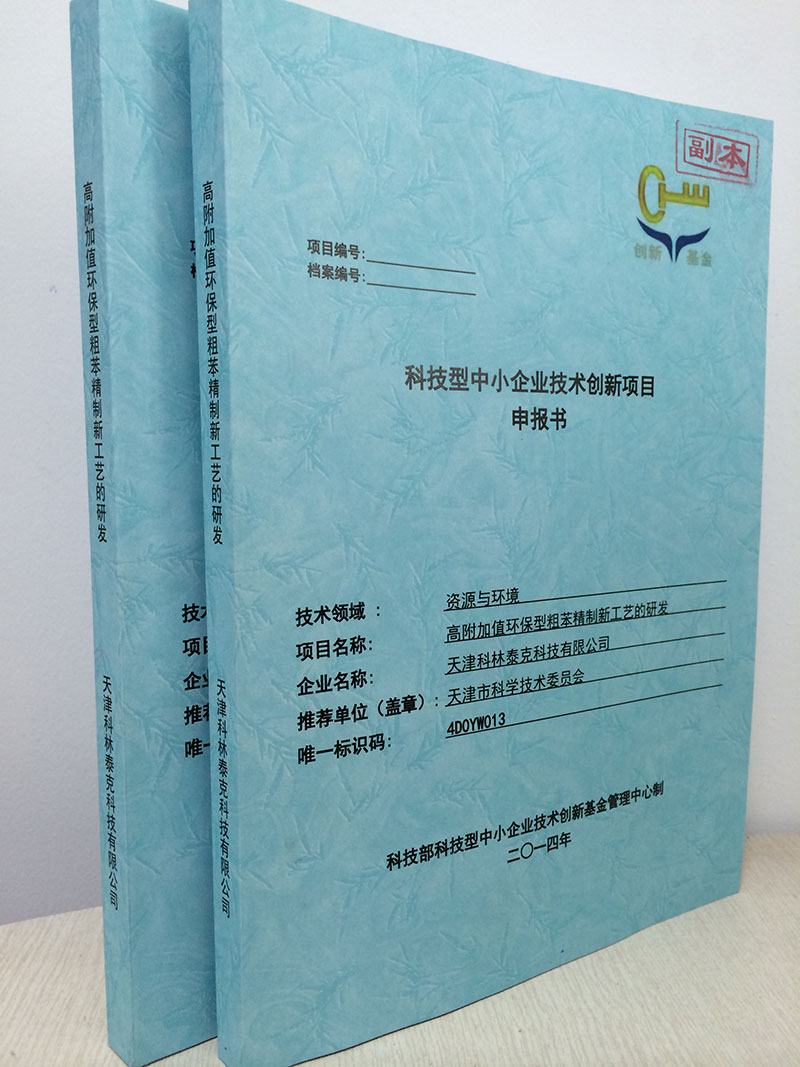 为促进我公司研发成果的推广应用,产生更大的经济和社会效益,我公司积极参与了2014年天津市创新基金申报工作,将我公司自主研发某项目进行了申报,该项目我公司具有完全自主知识产权,技术含量高,技术处于国内国际领先水平;该项目投产已产生很好的经济效益和社会效益,与同行也相比具有很强的市场竞争力。在公司申报小组成员的共同努力下,于12月编纂成册,顺利完成申报工作。
